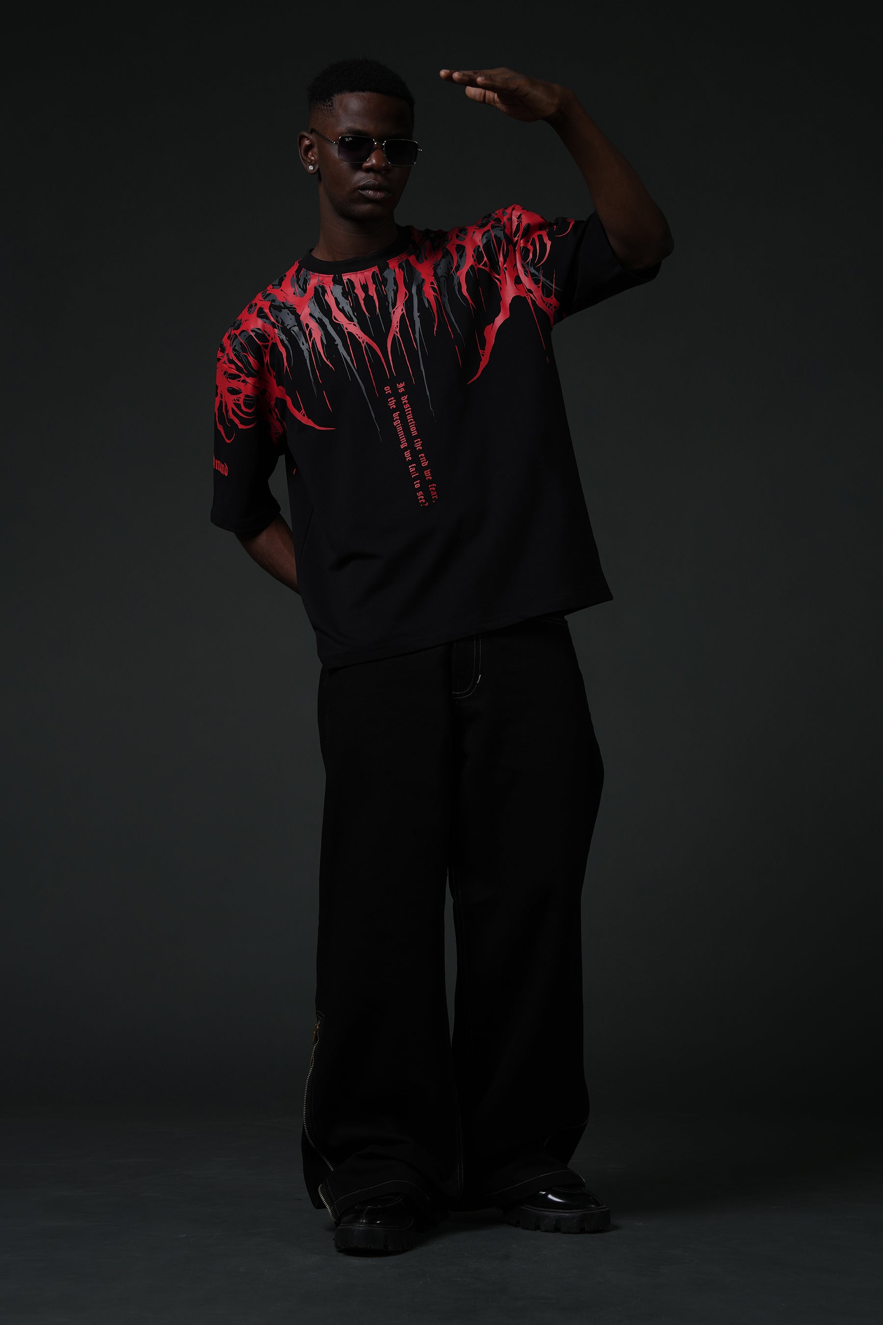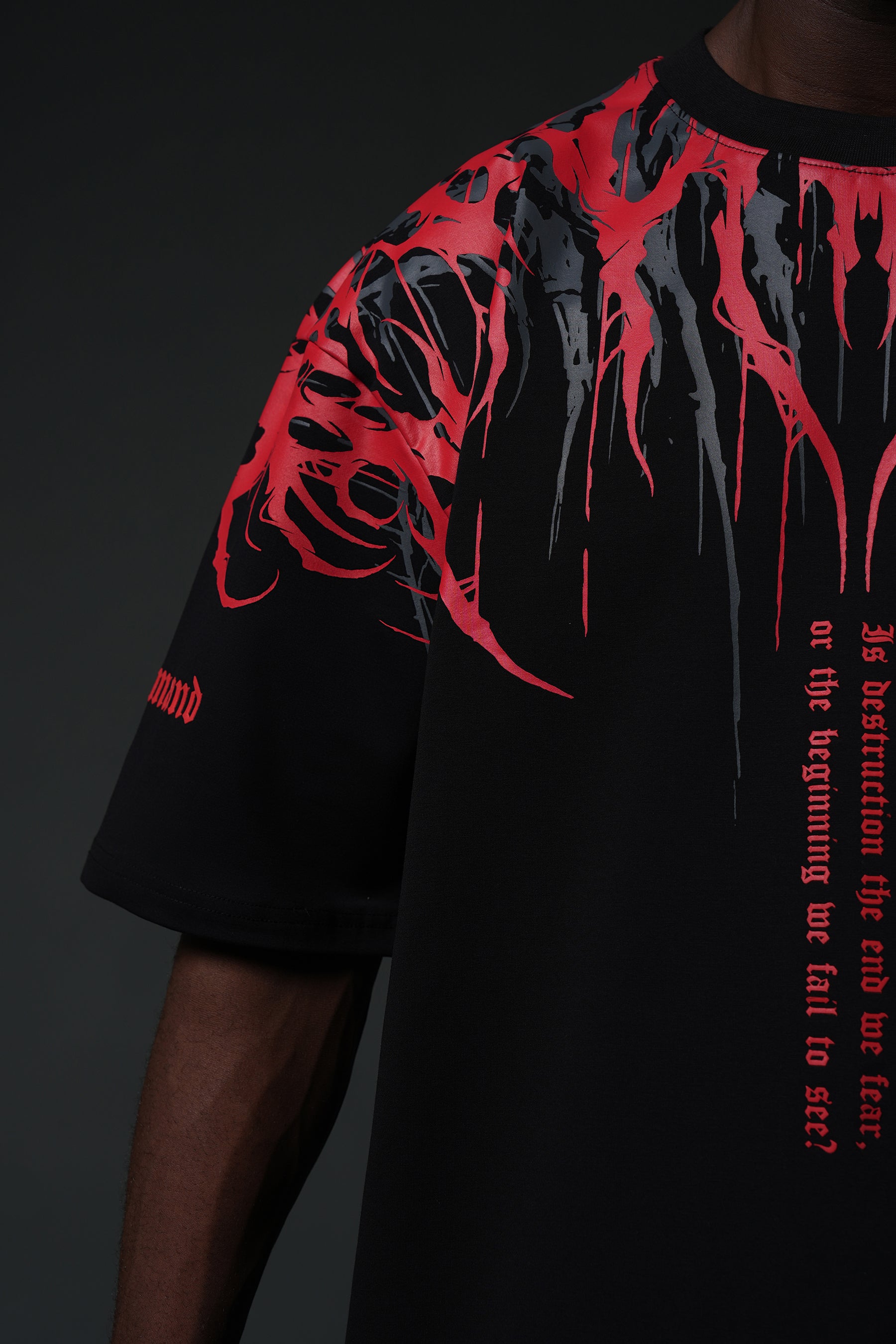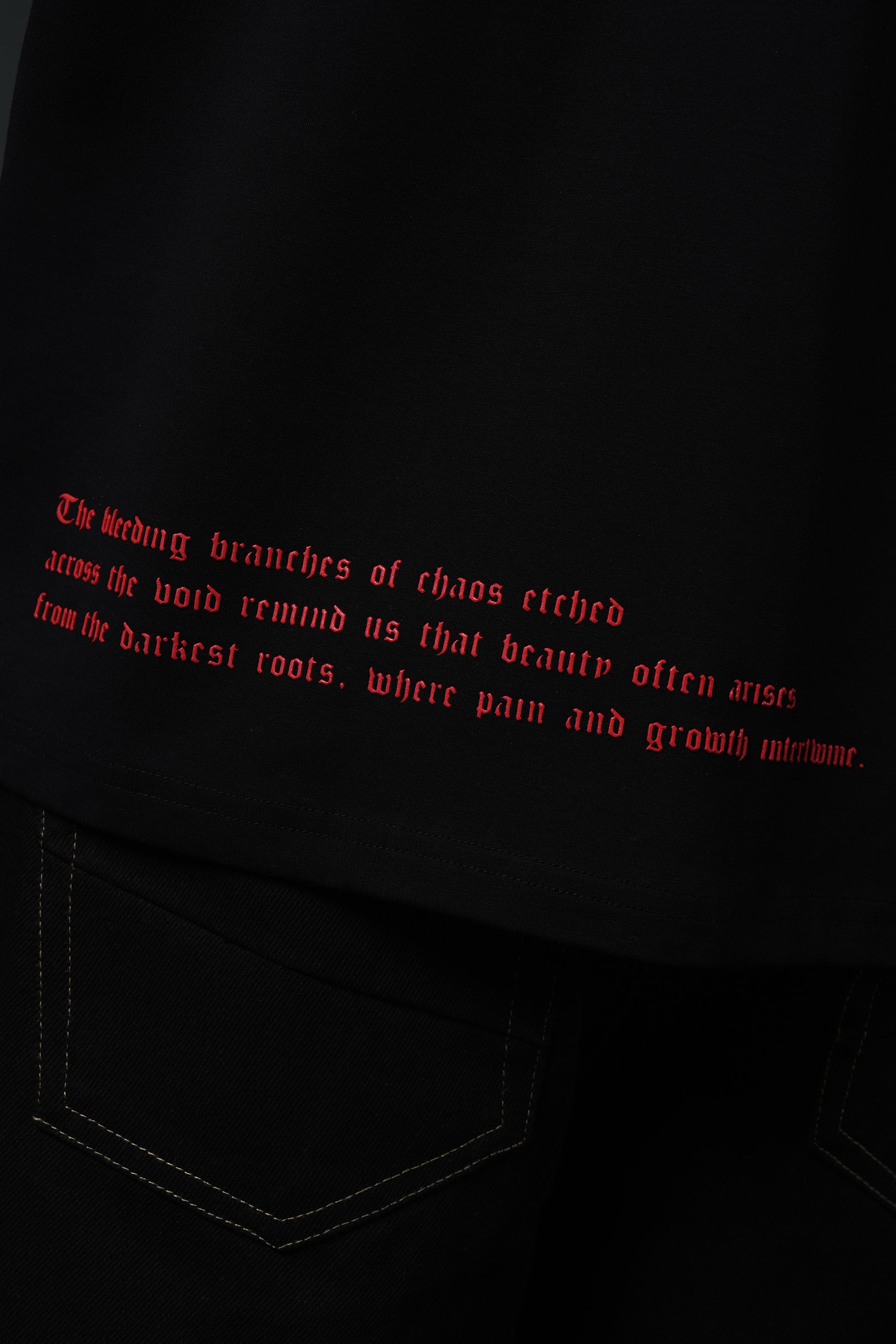 Molten red graphics burst from the shoulders, echoing shattered wings or bleeding thorns. Beneath them, a vertical gothic verse cuts through the chest like scripture carved in stone.