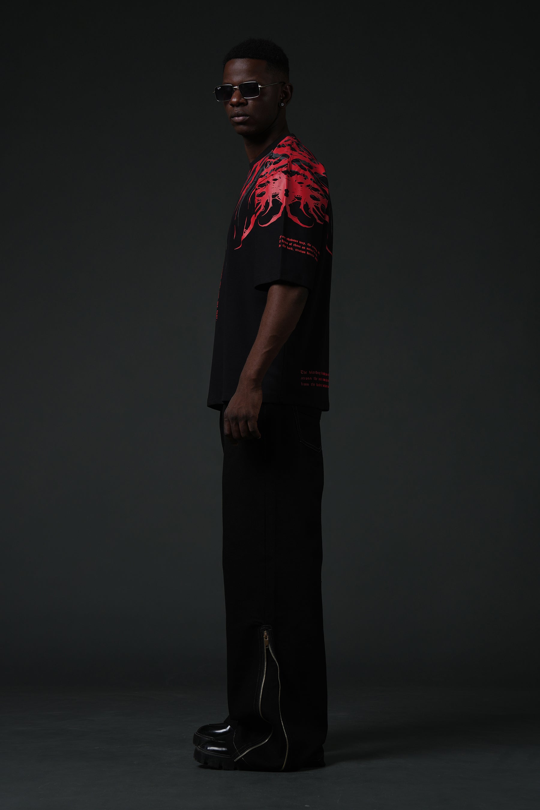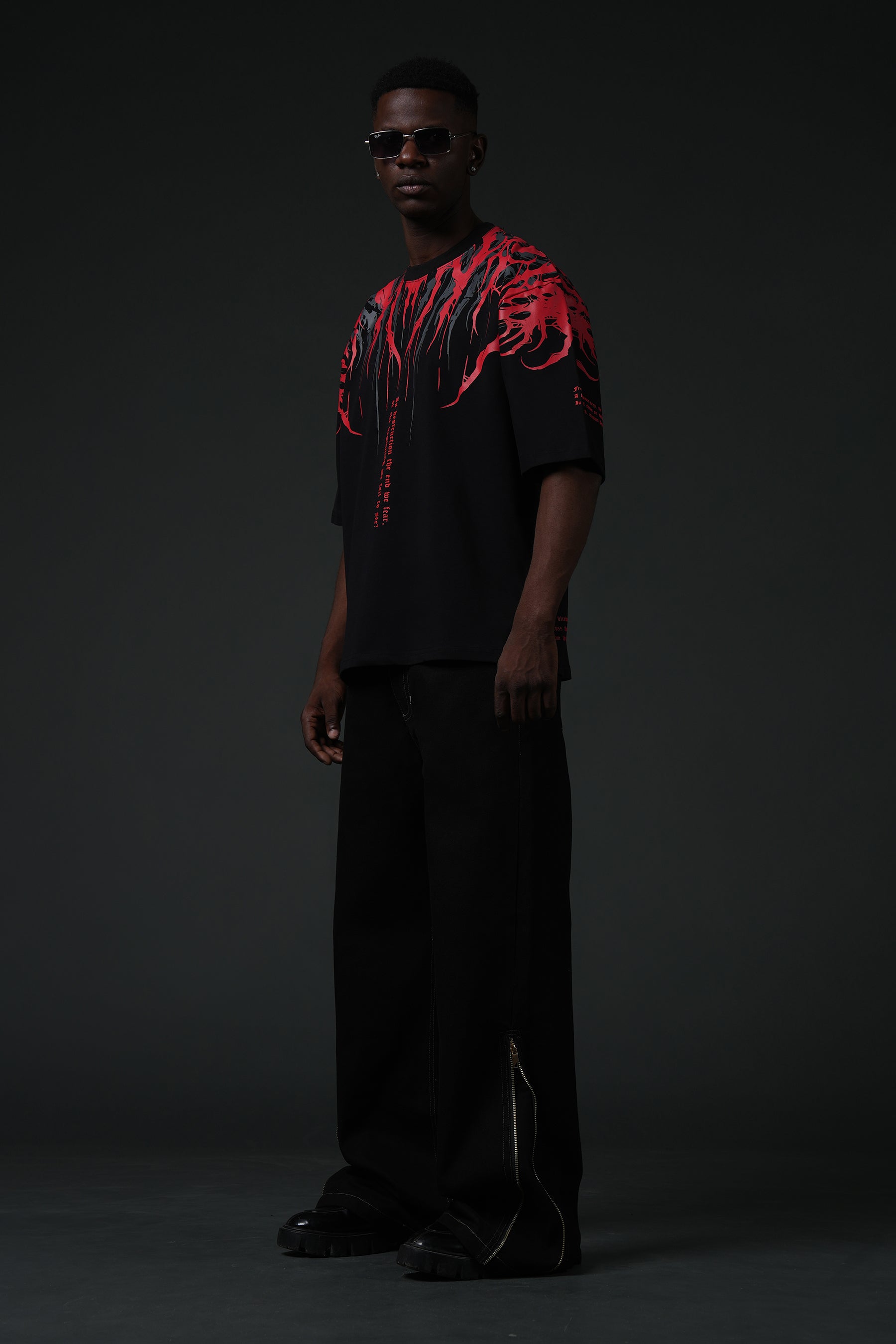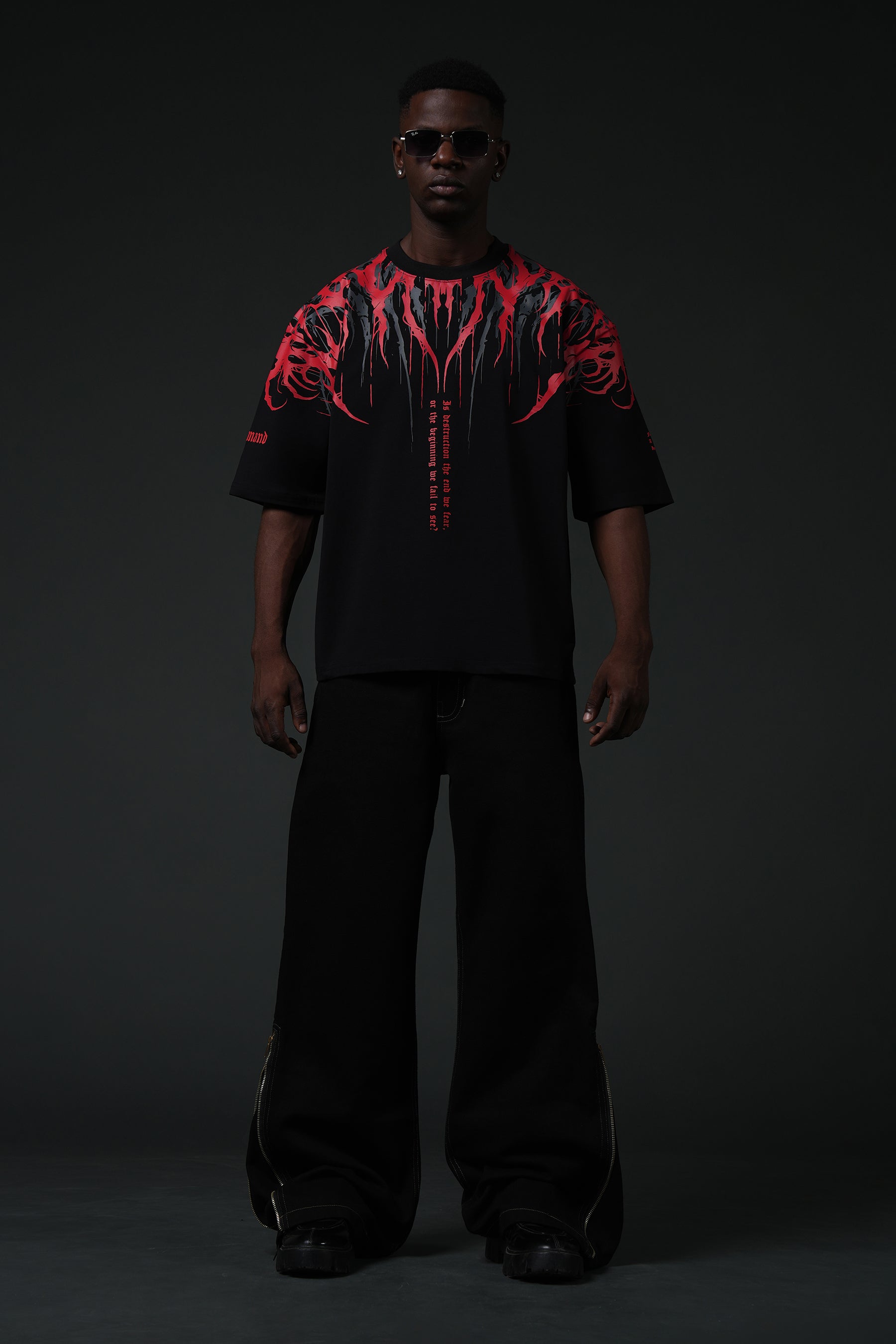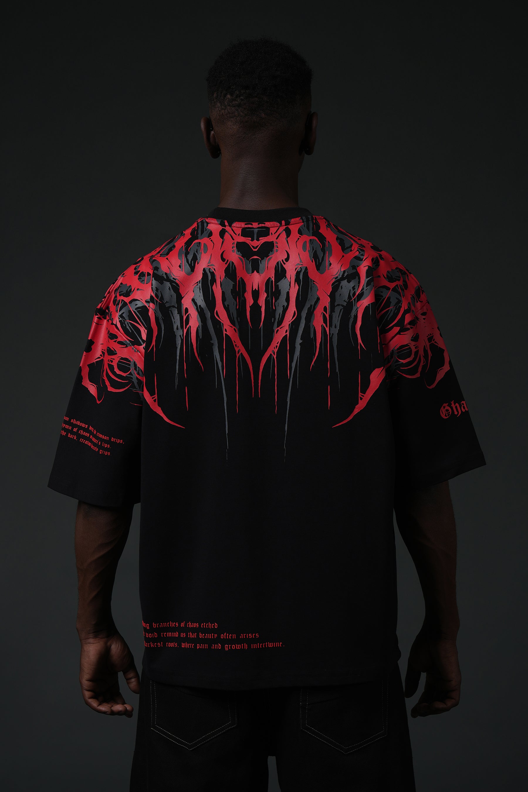 Molten red graphics burst from the shoulders, echoing shattered wings or bleeding thorns. Beneath them, a vertical gothic verse cuts through the chest like scripture carved in stone.