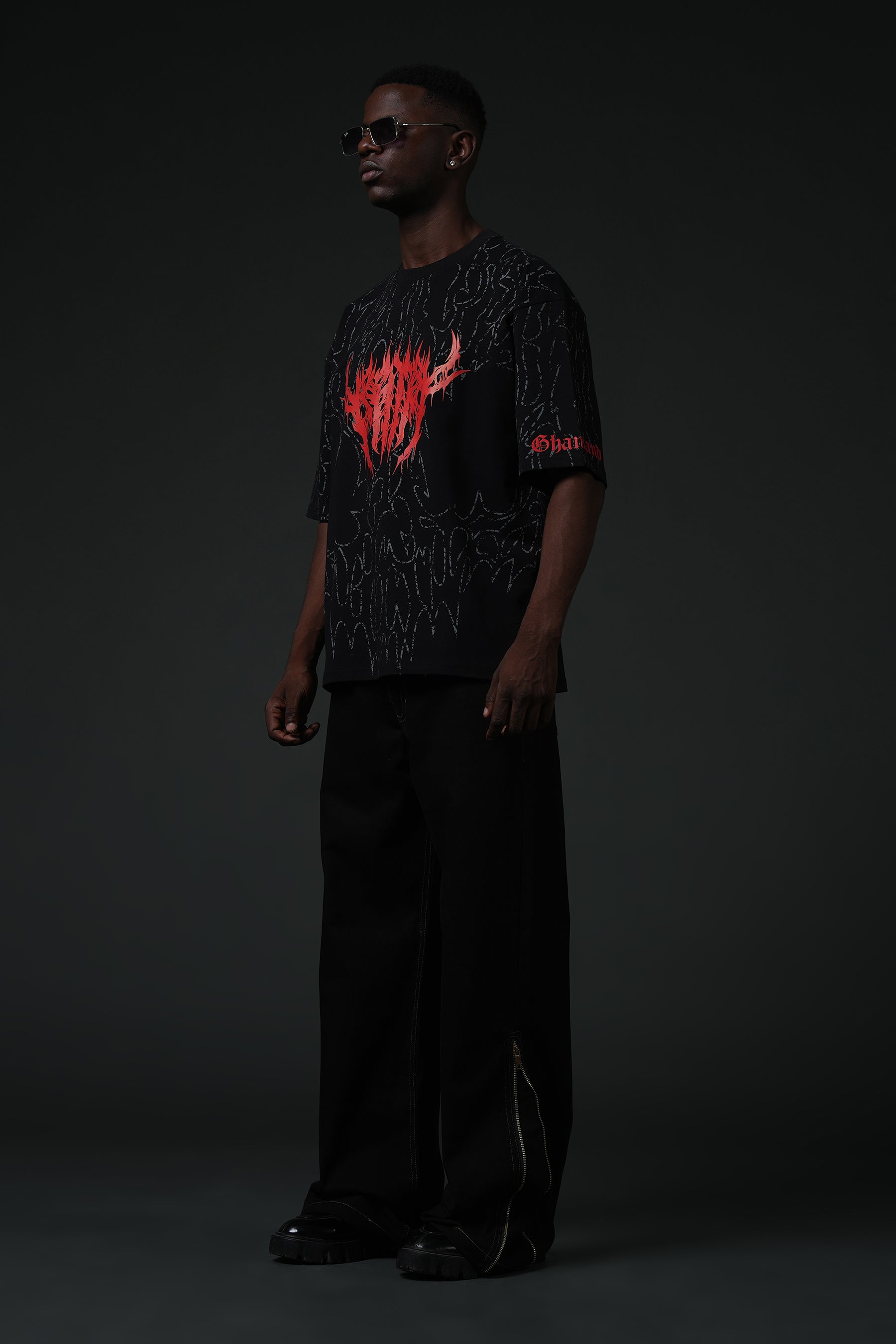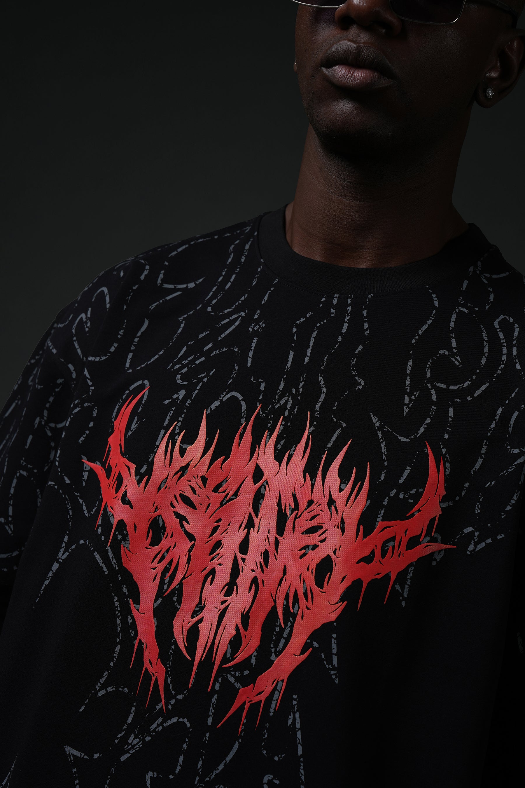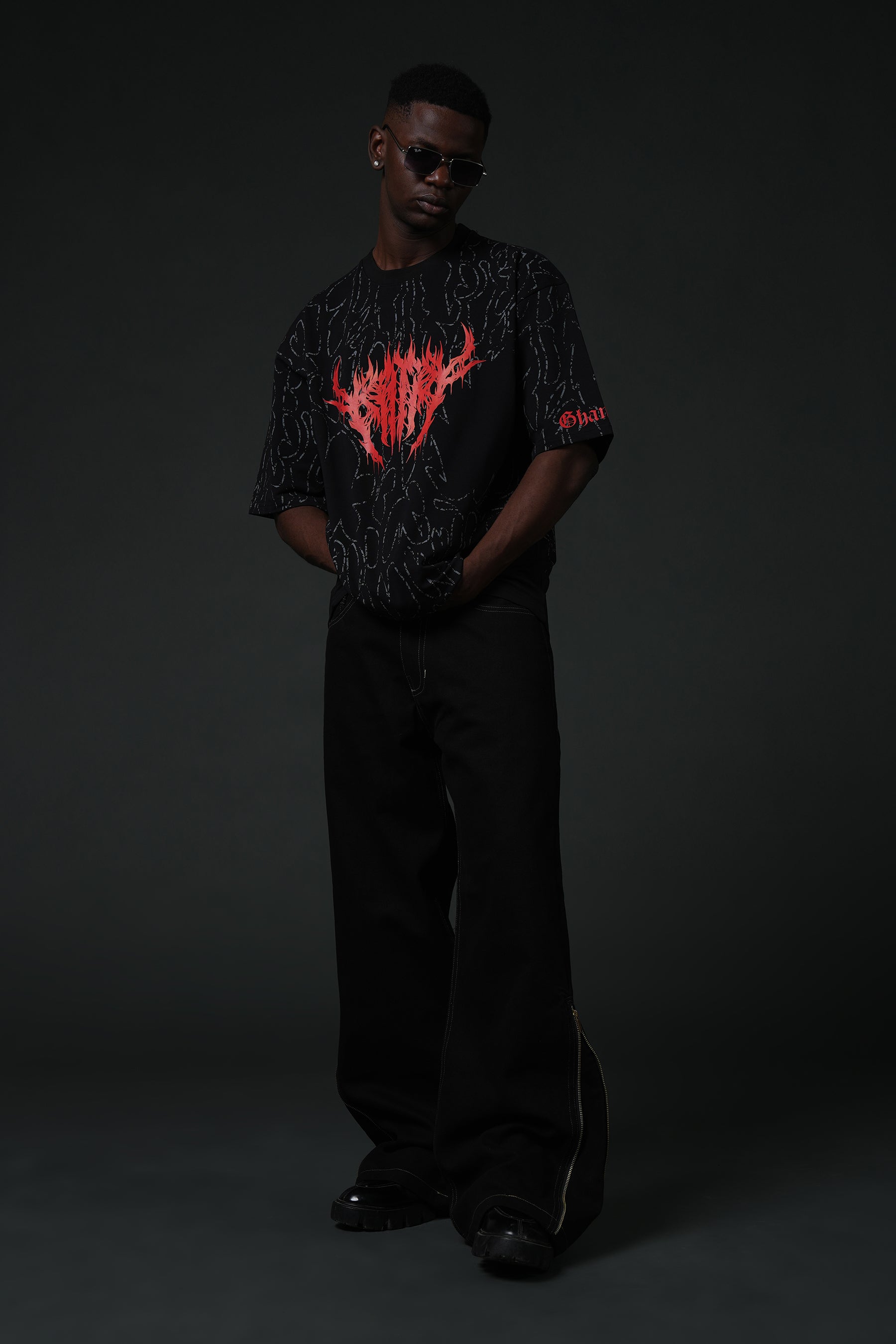 Veins of void writhe across the blackened canvas, each line a curse. The molten emblem at its heart is no design—it’s a wound still bleeding, a vow not yet fulfilled.