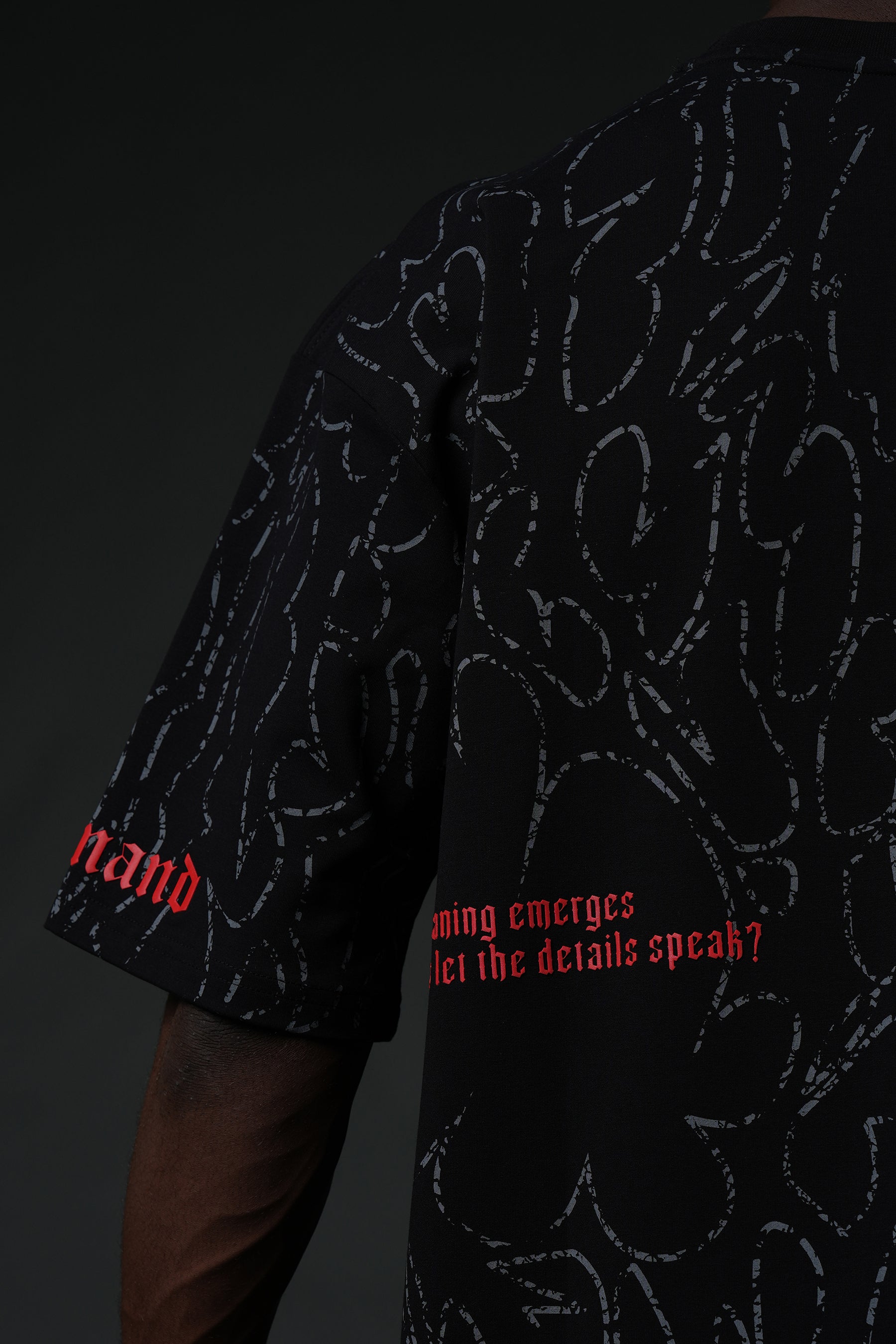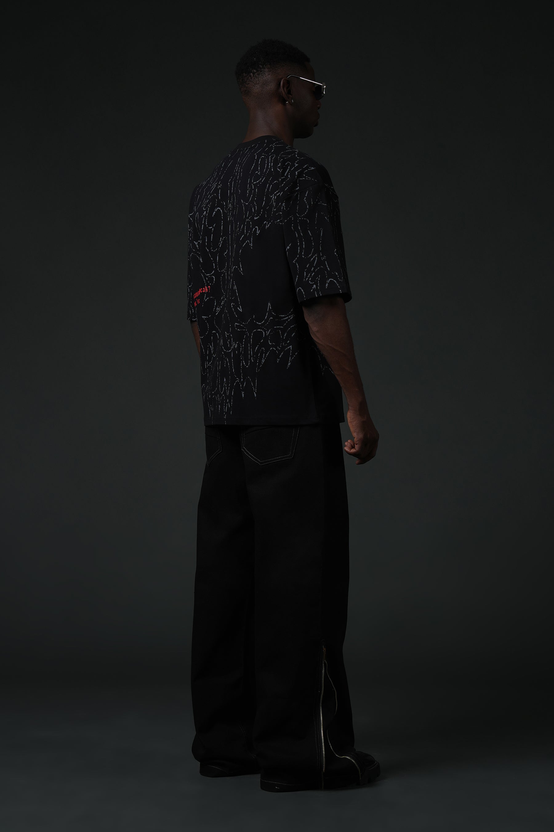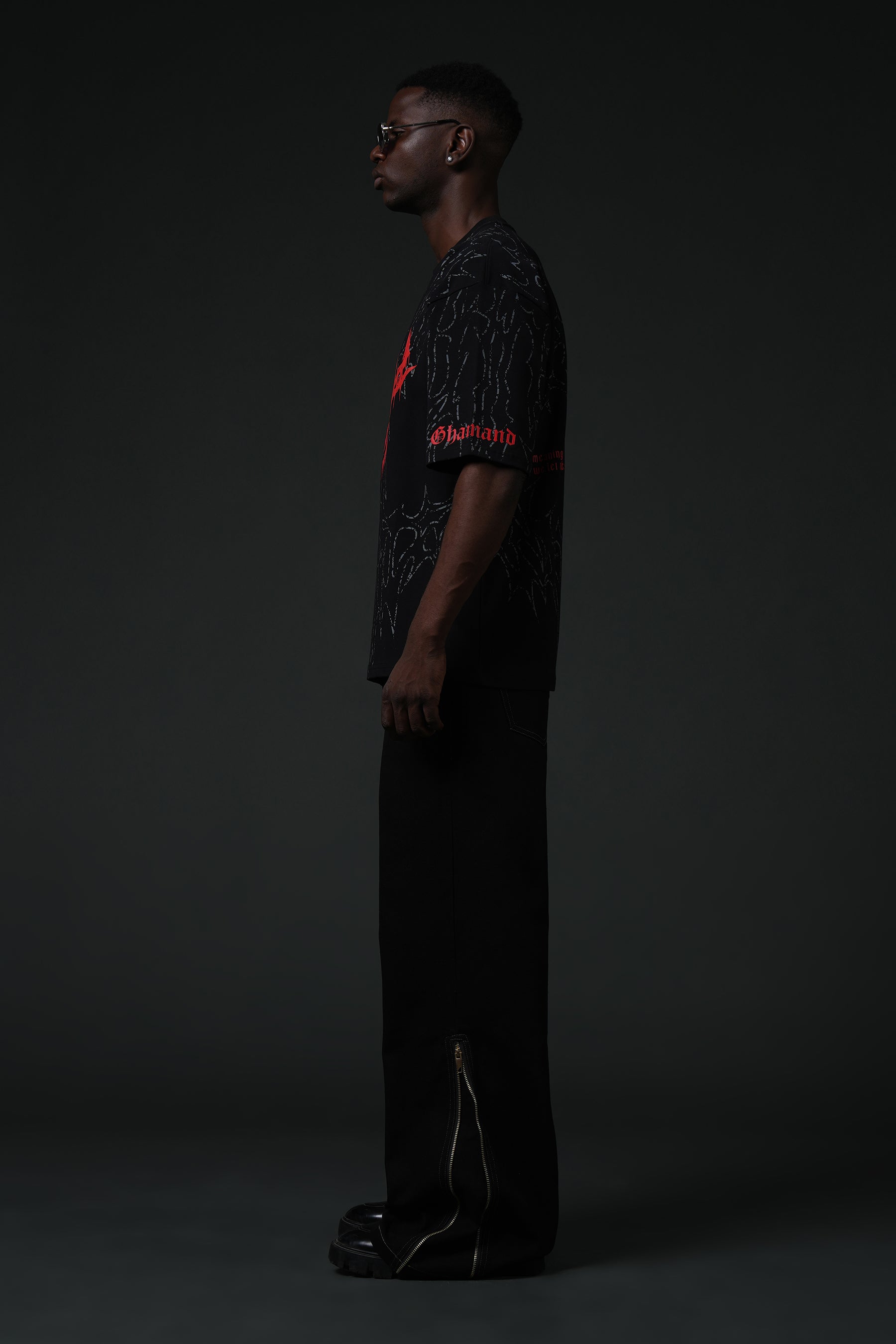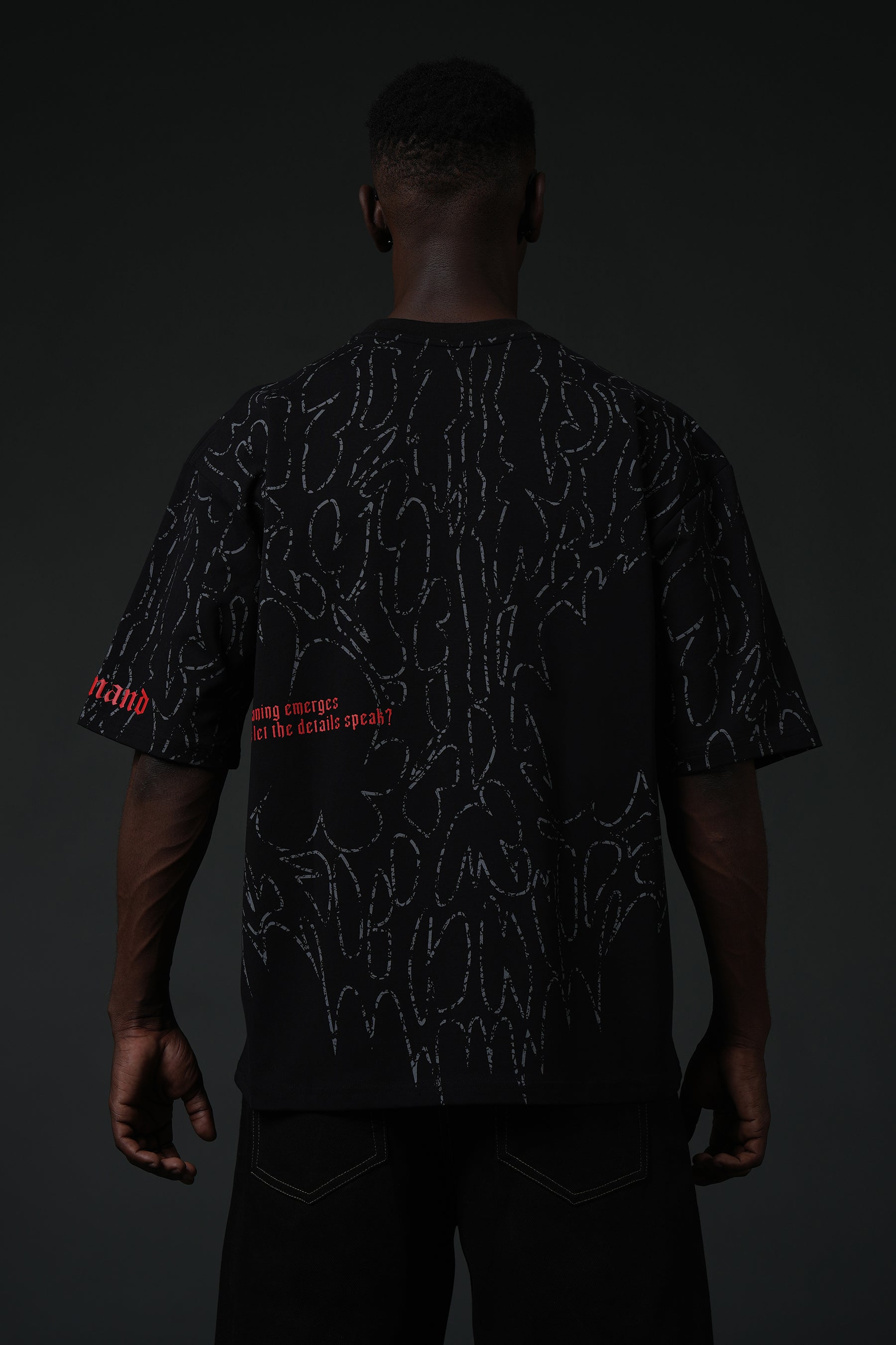 Veins of void writhe across the blackened canvas, each line a curse. The molten emblem at its heart is no design—it’s a wound still bleeding, a vow not yet fulfilled.