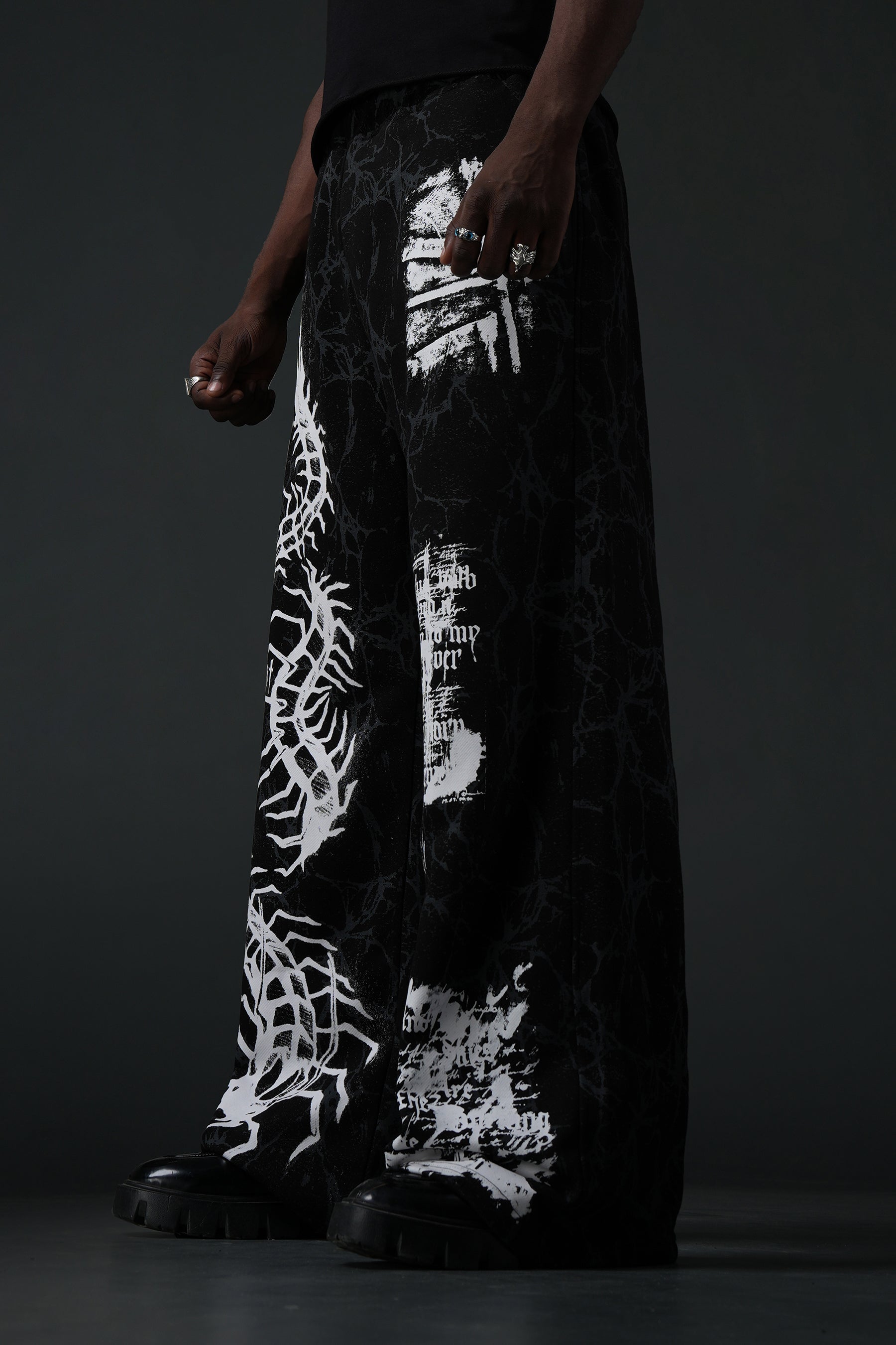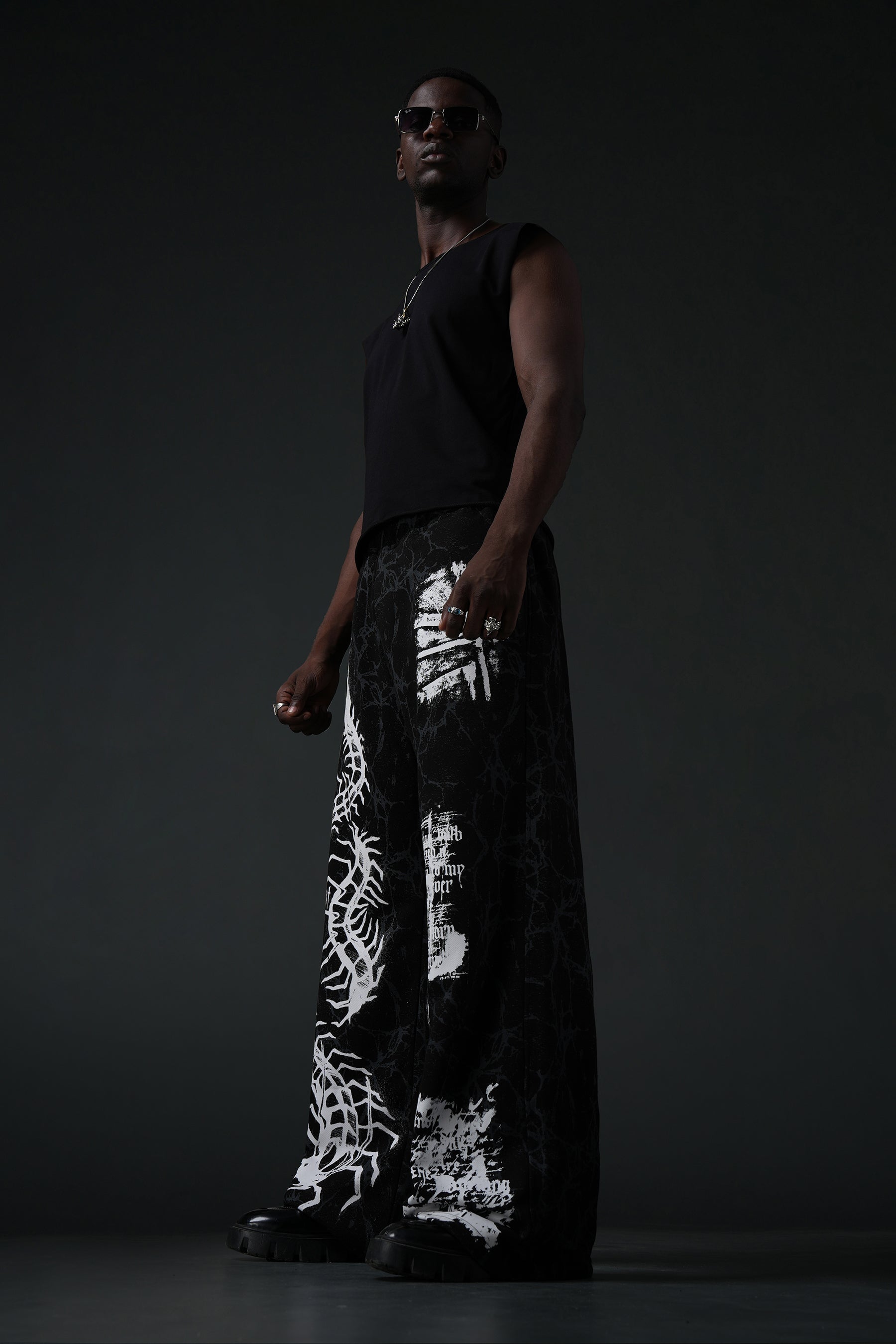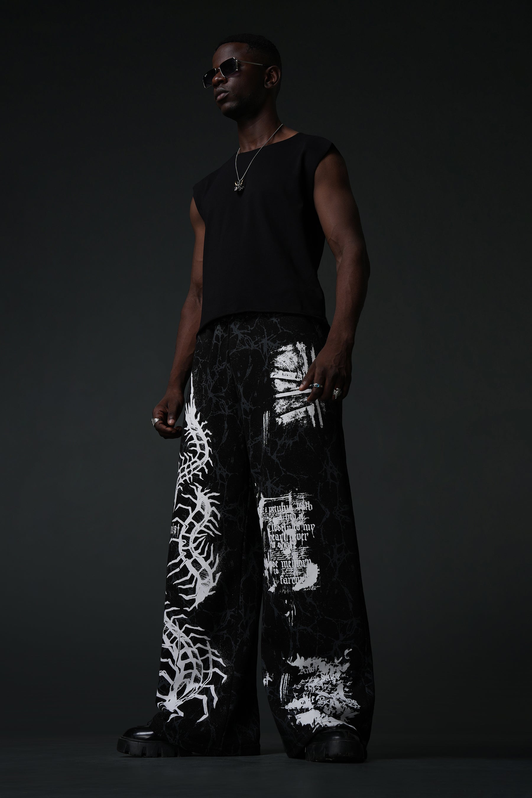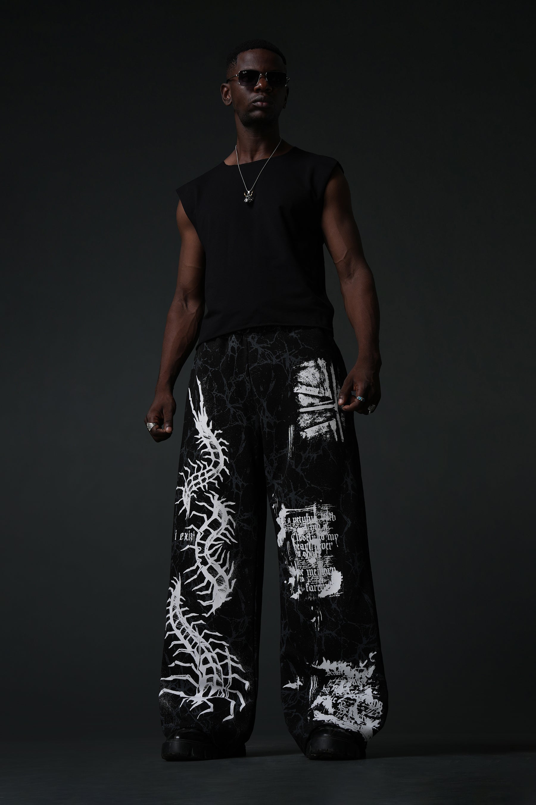 The Cyber Void trousers are a bold fusion of futuristic and gothic aesthetics. Crafted with a sleek black base, these wide-leg pants feature a striking white dragon design that winds intricately across the fabric, paired with a cracked, lightning-like pattern for a dynamic edge. Subtle, distressed text adds a mysterious, almost cryptic vibe, while the overall look is completed with a dark, moody finish. Perfect for making a statement, these trousers blend edgy streetwear with a touch of otherworldly flair, ideal for those who dare to stand out.