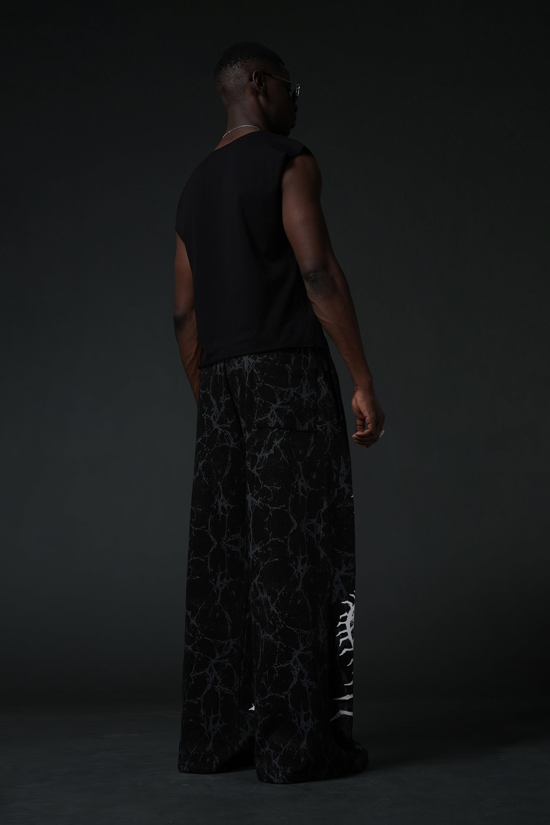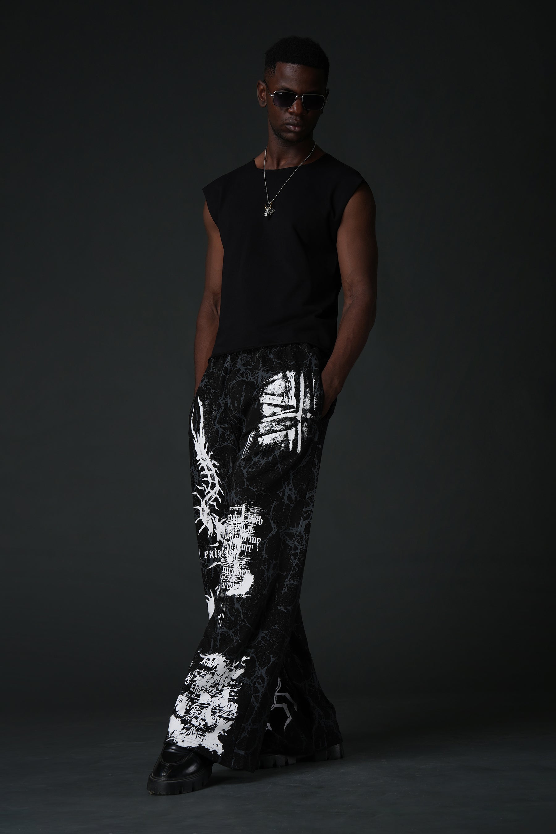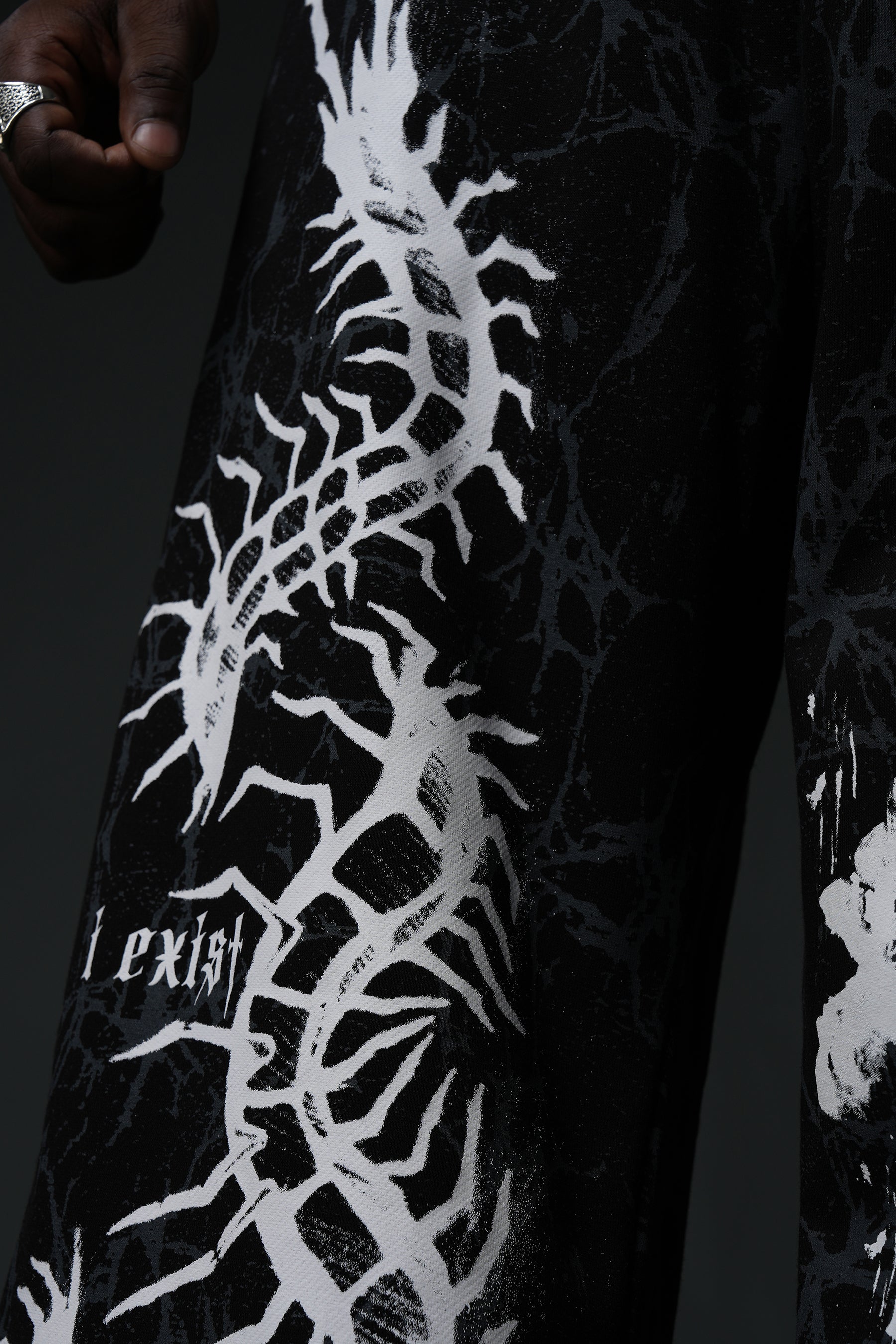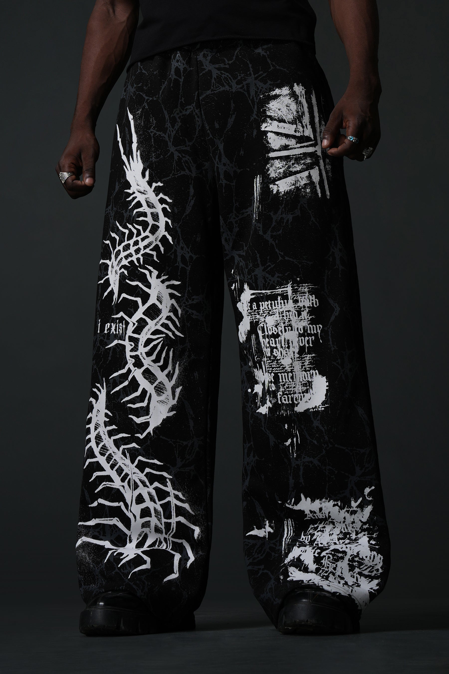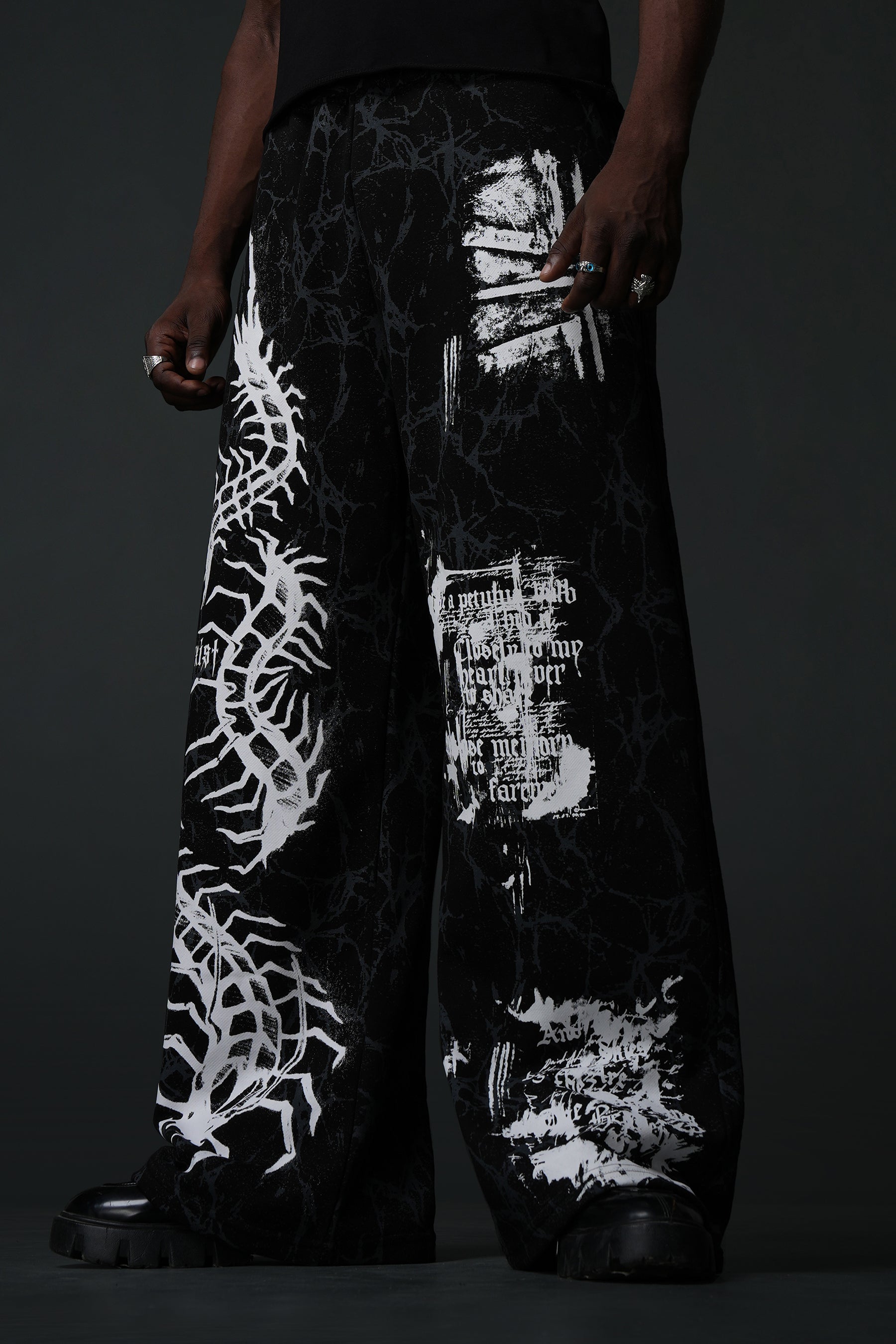 The Cyber Void trousers are a bold fusion of futuristic and gothic aesthetics. Crafted with a sleek black base, these wide-leg pants feature a striking white dragon design that winds intricately across the fabric, paired with a cracked, lightning-like pattern for a dynamic edge. Subtle, distressed text adds a mysterious, almost cryptic vibe, while the overall look is completed with a dark, moody finish. Perfect for making a statement, these trousers blend edgy streetwear with a touch of otherworldly flair, ideal for those who dare to stand out.