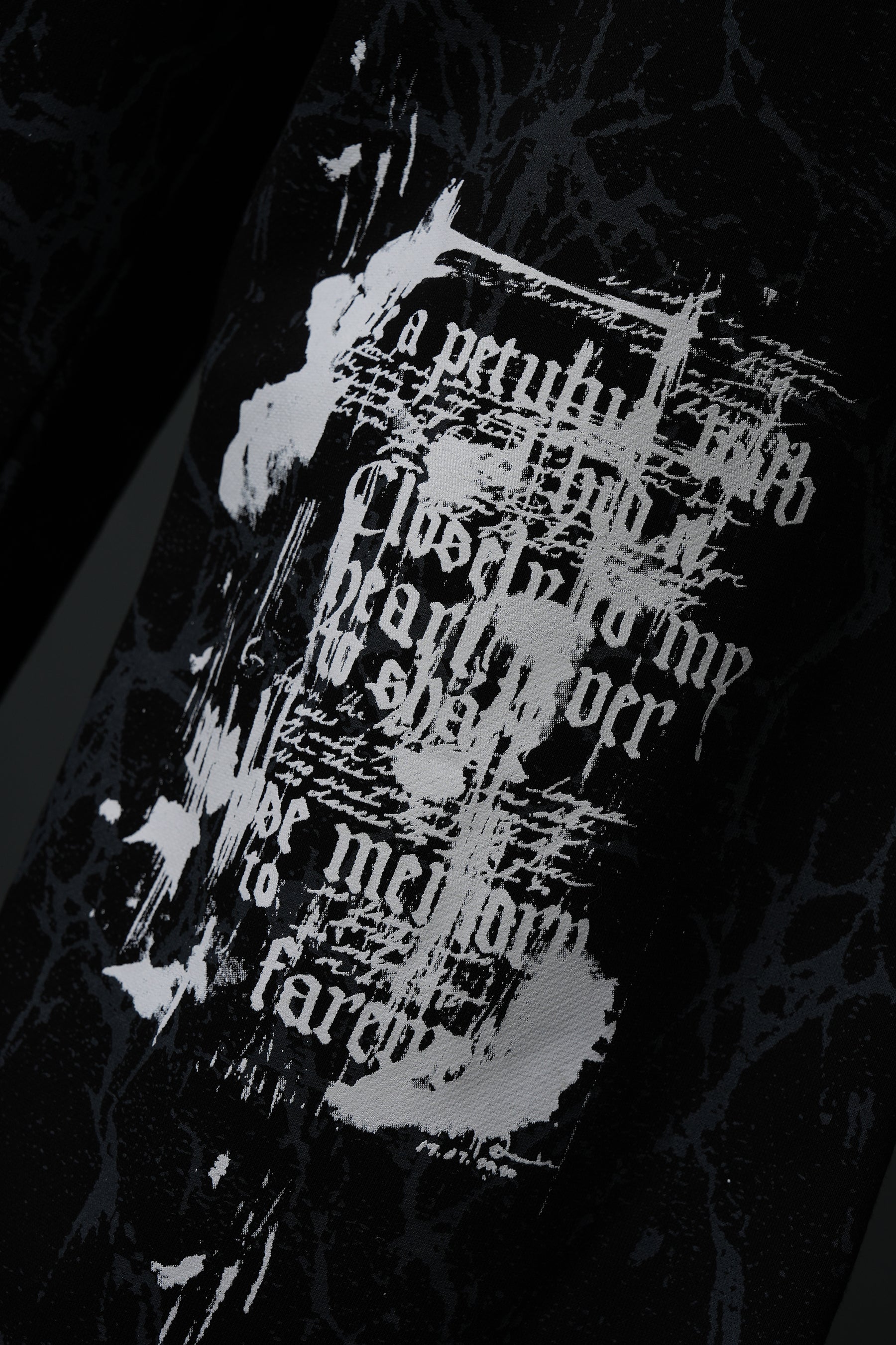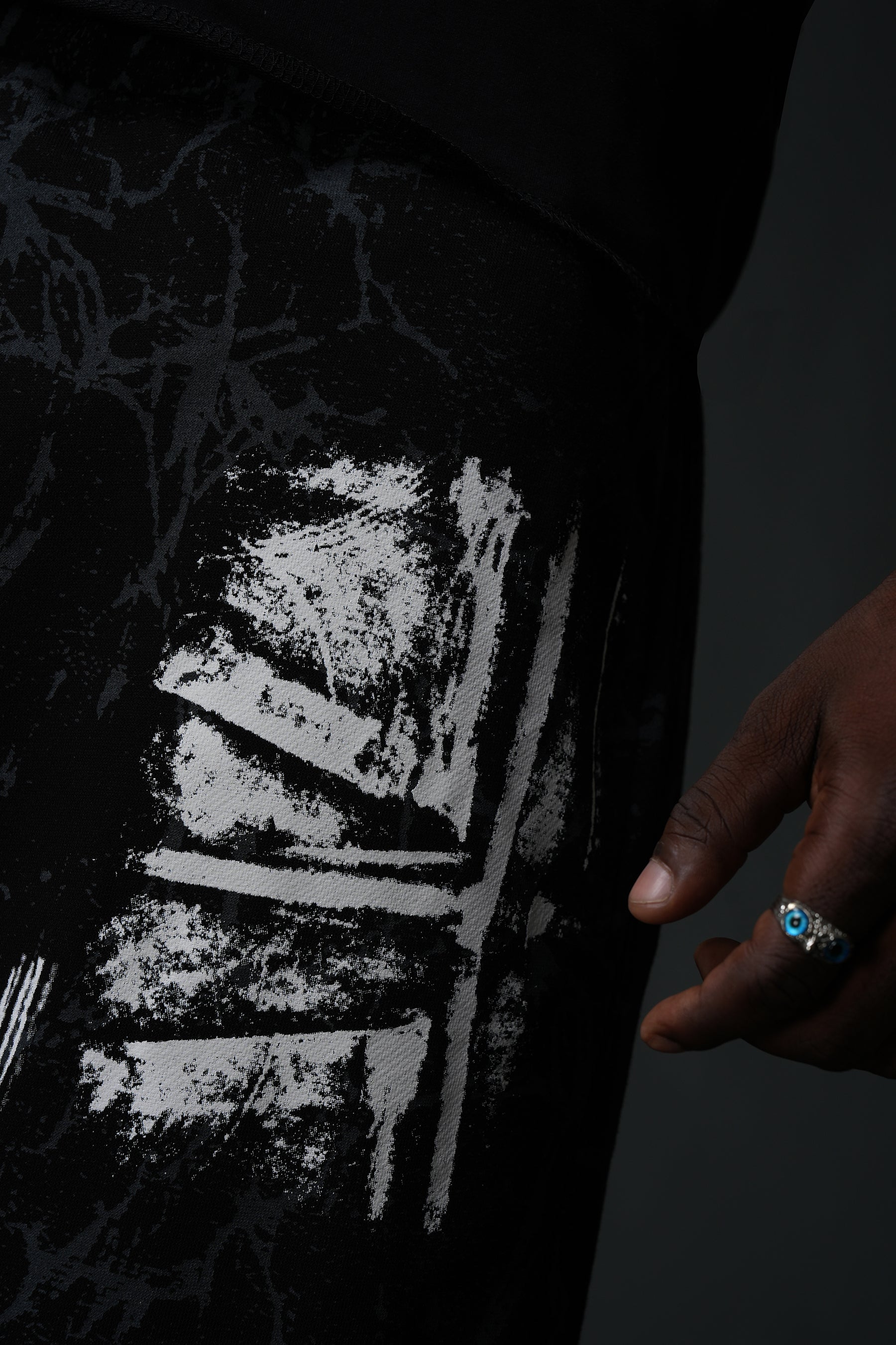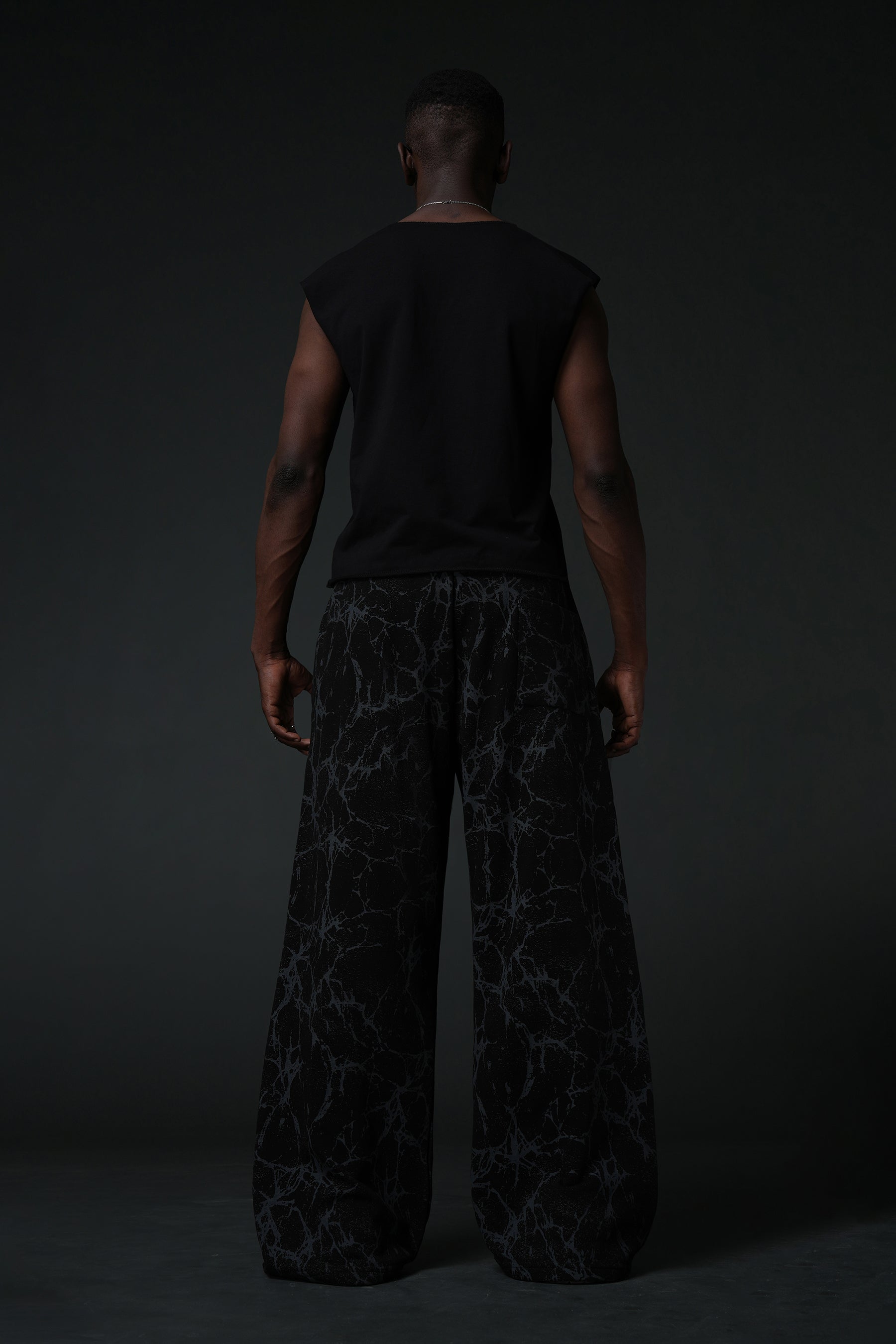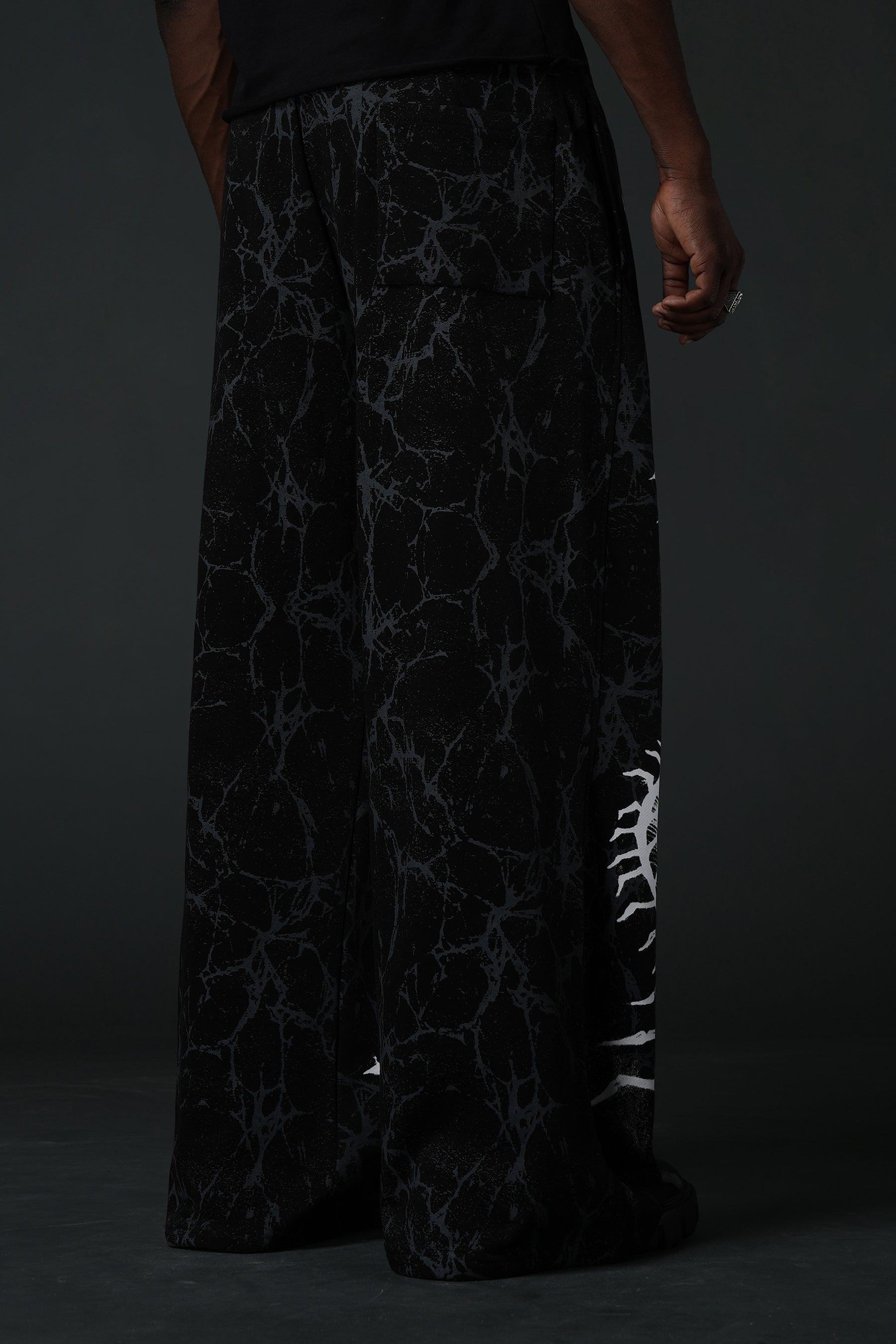 The Cyber Void trousers are a bold fusion of futuristic and gothic aesthetics. Crafted with a sleek black base, these wide-leg pants feature a striking white dragon design that winds intricately across the fabric, paired with a cracked, lightning-like pattern for a dynamic edge. Subtle, distressed text adds a mysterious, almost cryptic vibe, while the overall look is completed with a dark, moody finish. Perfect for making a statement, these trousers blend edgy streetwear with a touch of otherworldly flair, ideal for those who dare to stand out.