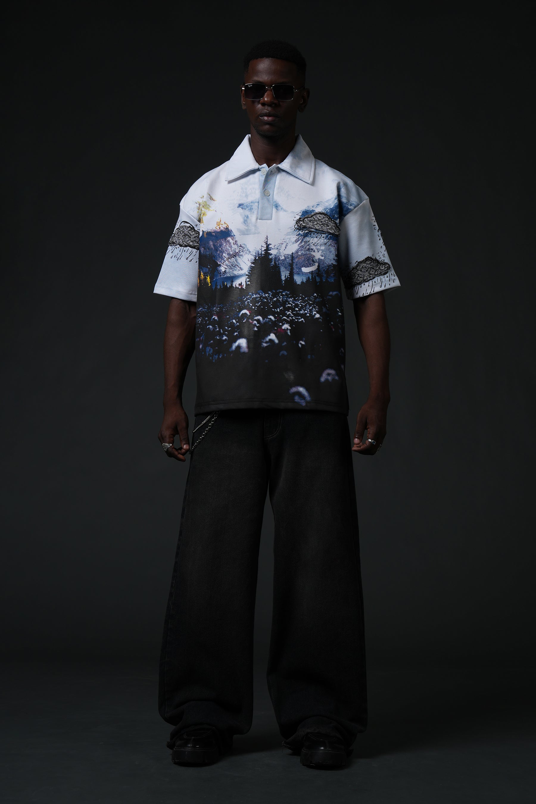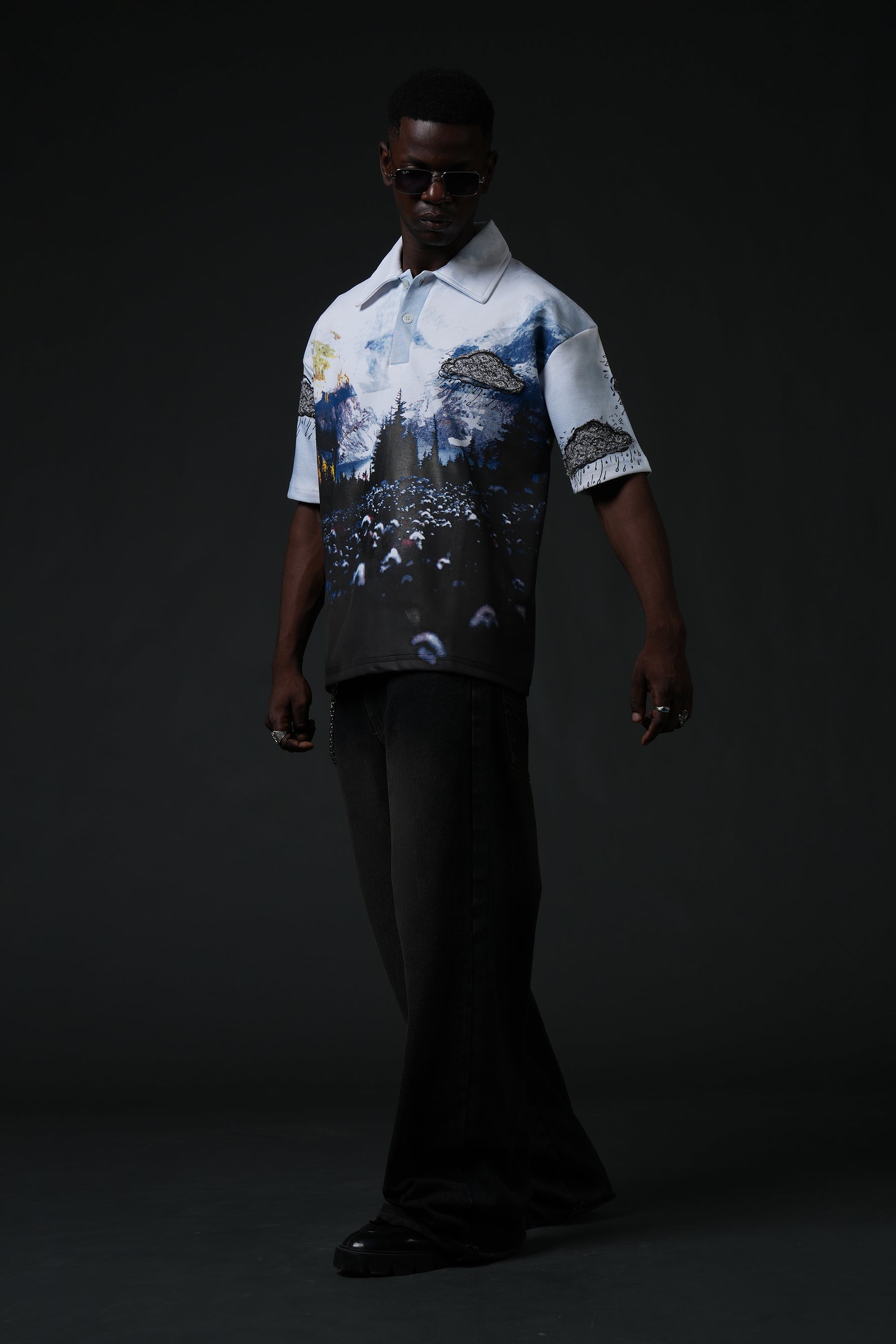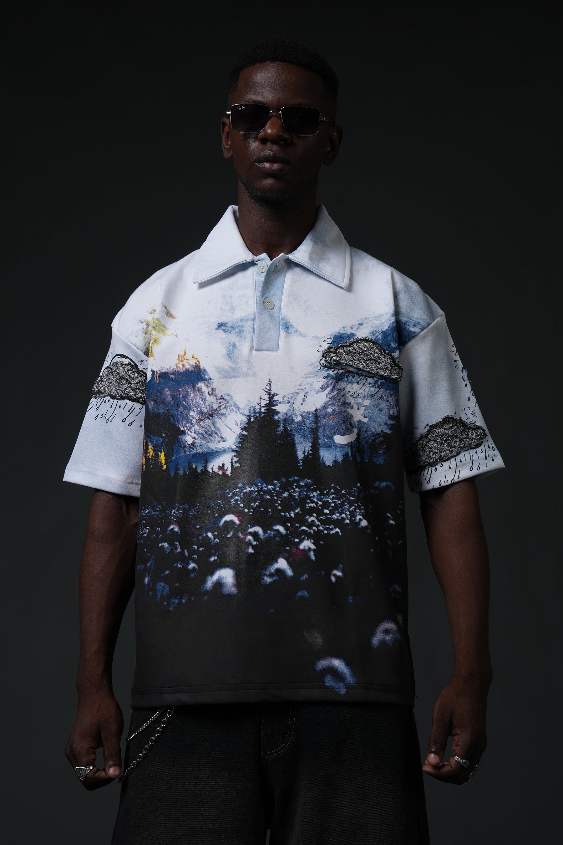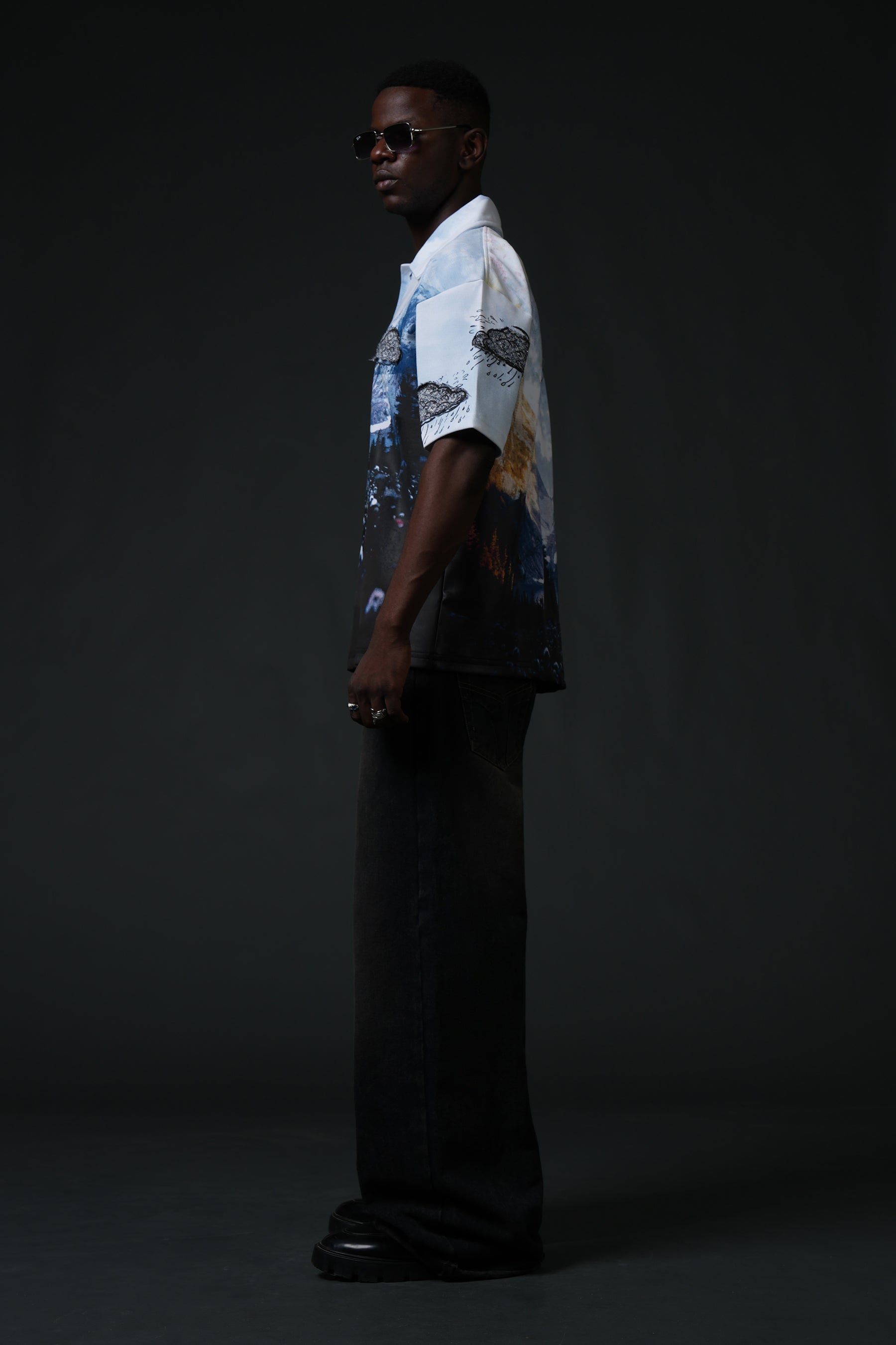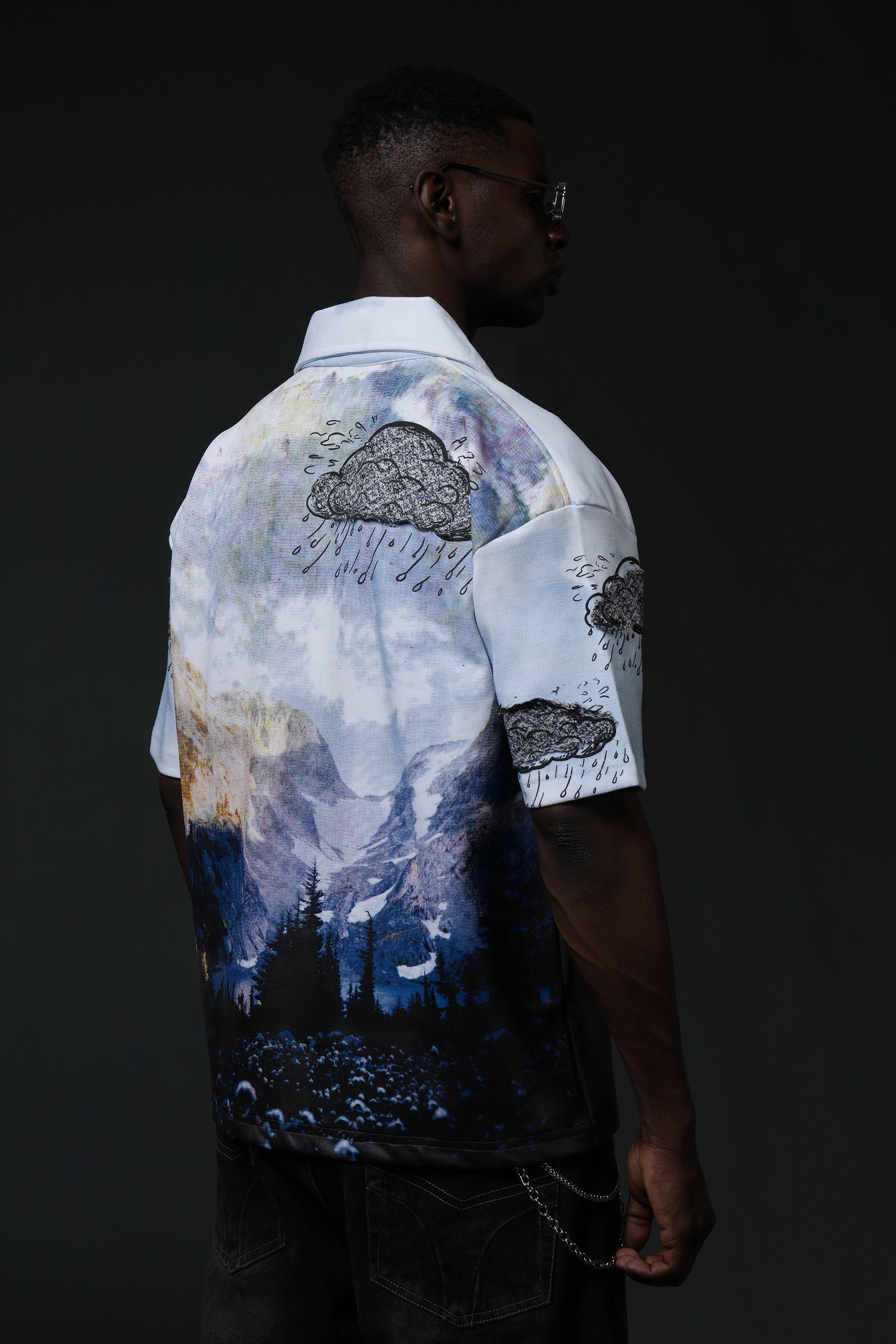 The Meghdoot Udaan Shirt captures the tension between chaos and calm—otherworldly rain clouds, migrating birds, burning trees, and distant mountains collide in a visual poem. This shirt doesn’t just depict a scene; it evokes a journey. Inspired by Kalidasa’s “Meghdoot,” where clouds are bearers of longing and messages, the shirt becomes a canvas for yearning, displacement, and wild natural forces. Flying birds at the base hint at both freedom and unrest, while the embroidered clouds raining on both sleeves feel like a blessing and a warning. It’s drama wrapped in serenity.