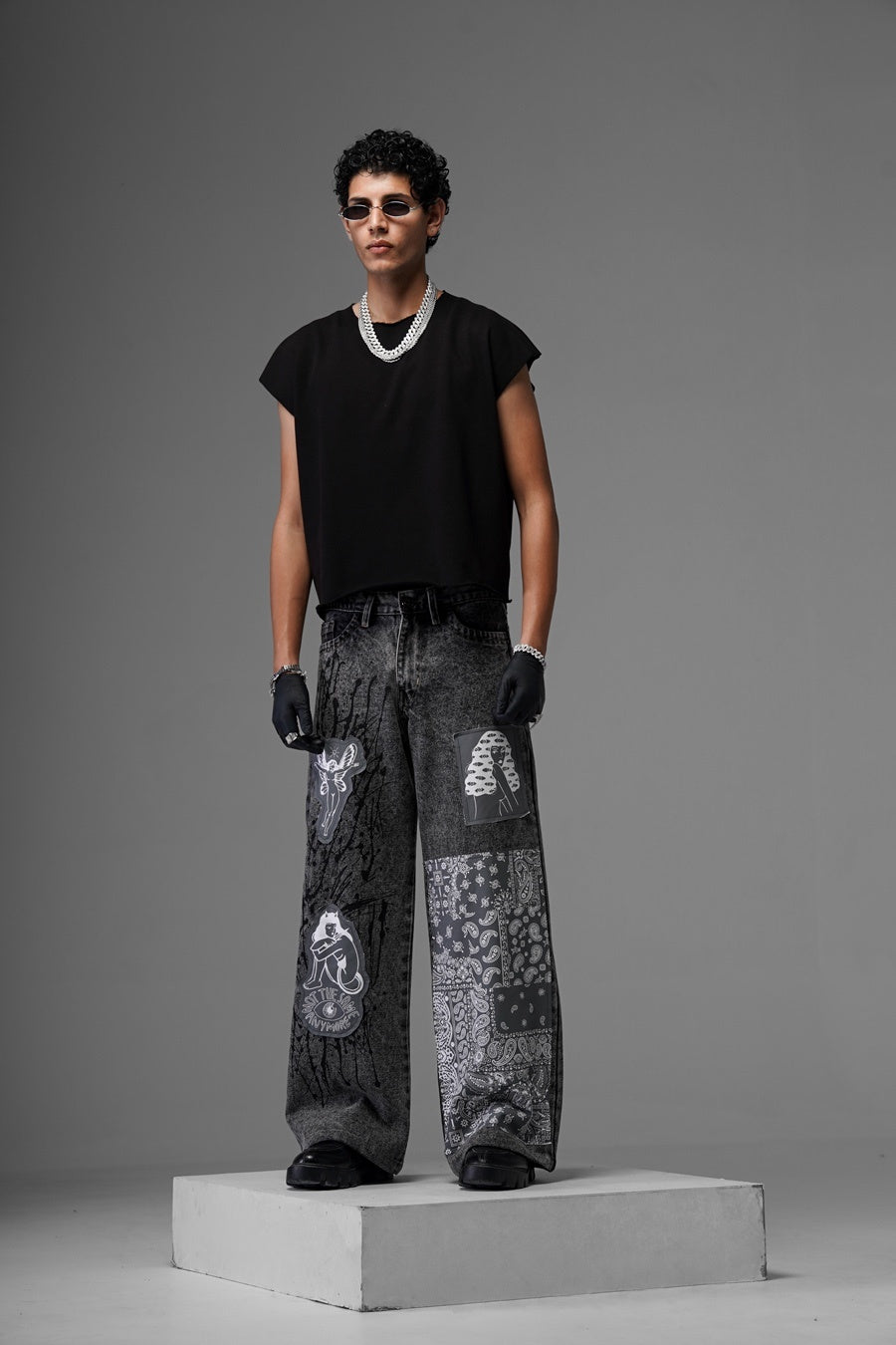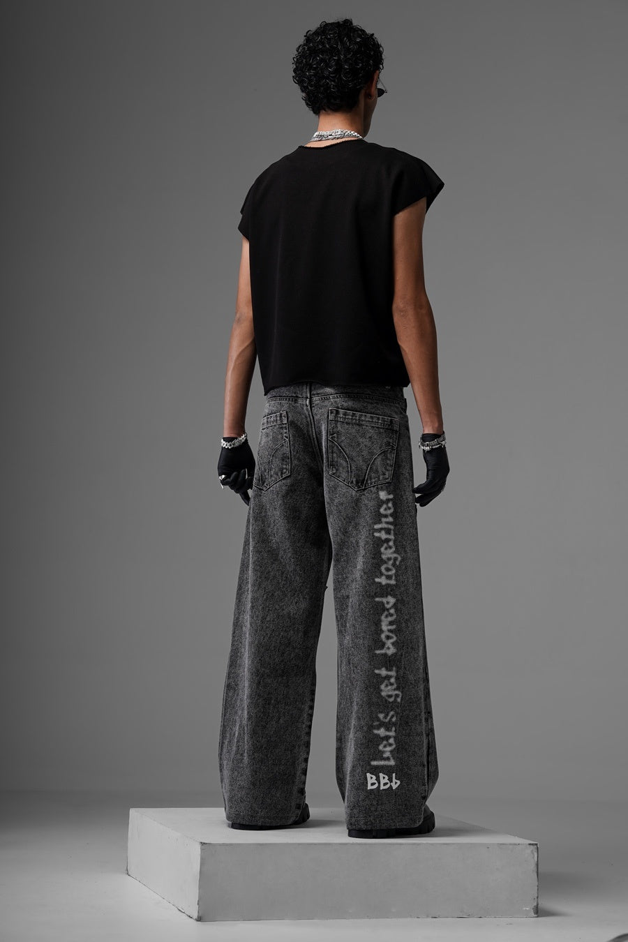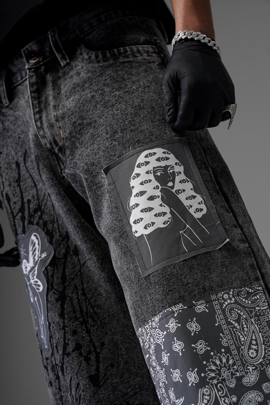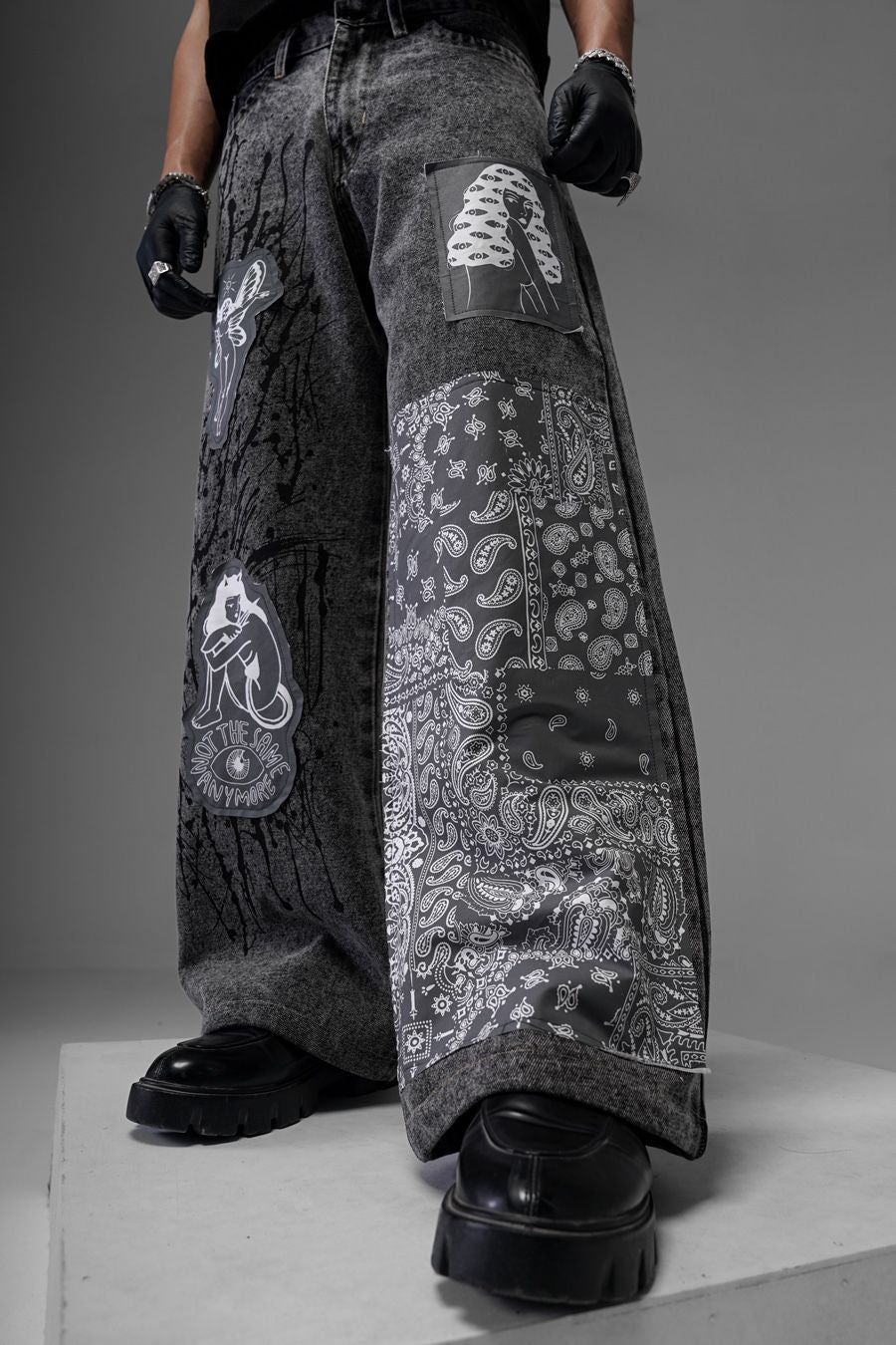 Born from the streets where art meets rebellion, the Rebel Graffiti Jeans are a canvas of expression. Our designer, inspired by urban graffiti and the whispers of untold stories, decided to bring that raw energy to fashion. The intricate patches, including a fairy-like figure and a stark message saying "NOT THE SAME ANYMORE," challenge the norm. The slogan "let's get bored together," running down one leg, is a cheeky nod to finding solace in shared ennui amidst the chaos. The blend of bold graphics and graffiti-style text caught the eye of critics, turning skepticism into admiration. These jeans became a symbol of defiance and creativity, perfect for those who walk the line between art and anarchy.